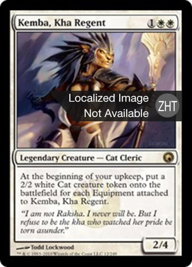 | Rules | At the beginning of your upkeep, create a 2/2 white Cat creature token for each Equipment attached to Kemba, Kha Regent. |