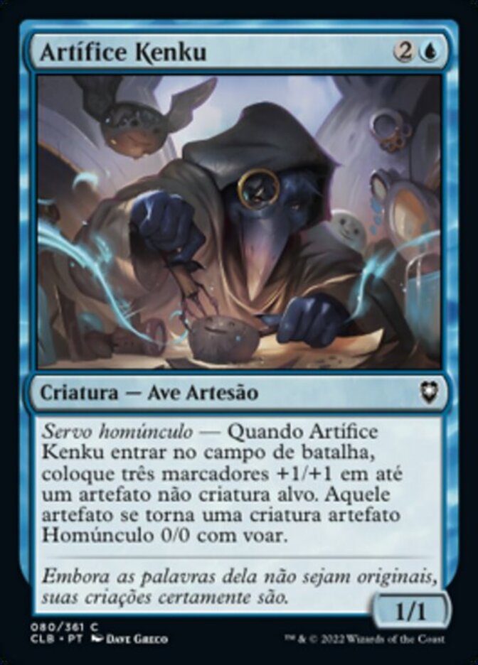 | Rules | Homunculus Servant — When Kenku Artificer enters the battlefield, put three +1/+1 counters on up to one target noncreature artifact. That artifact becomes a 0/0 Homunculus artifact creature with flying. |
