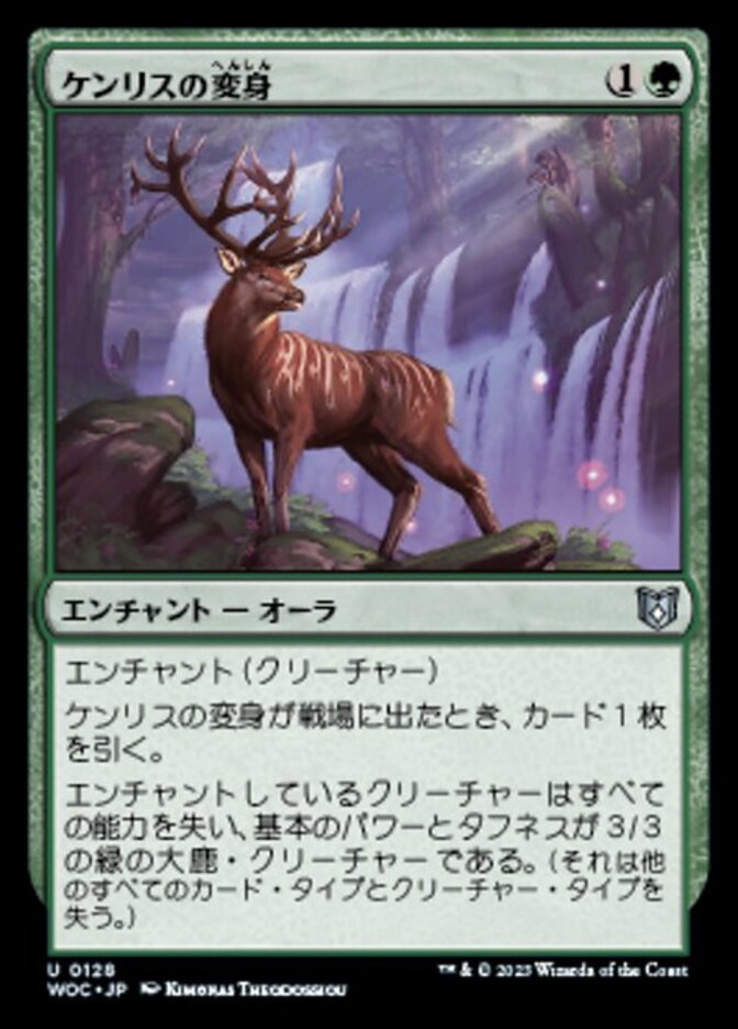 | Rules | Enchant creature When Kenrith's Transformation enters the battlefield, draw a card. Enchanted creature loses all abilities and is a green Elk creature with base power and toughness 3/3. (It loses all other card types and creature types.) |