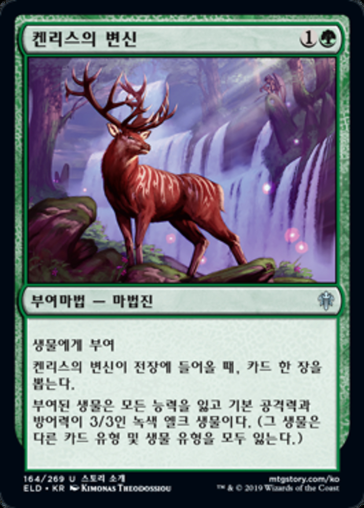 | Rules | Enchant creature When Kenrith's Transformation enters the battlefield, draw a card. Enchanted creature loses all abilities and is a green Elk creature with base power and toughness 3/3. (It loses all other card types and creature types.) |