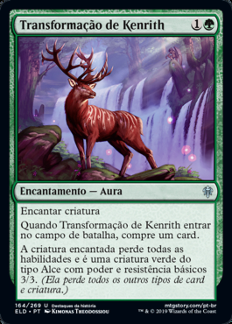 | Rules | Enchant creature When Kenrith's Transformation enters the battlefield, draw a card. Enchanted creature loses all abilities and is a green Elk creature with base power and toughness 3/3. (It loses all other card types and creature types.) |