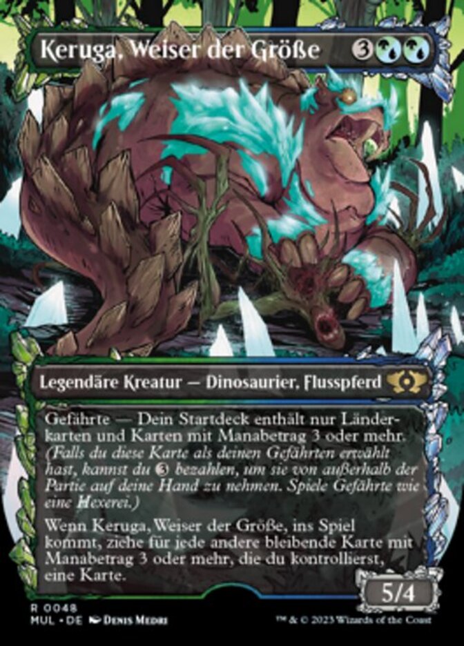 | Rules | Companion — Your starting deck contains only cards with mana value 3 or greater and land cards. (If this card is your chosen companion, you may put it into your hand from outside the game for any time you could cast a sorcery.) When Keruga, the Macrosage enters the battlefield, draw a card for each other permanent you control with mana value 3 or greater. |
