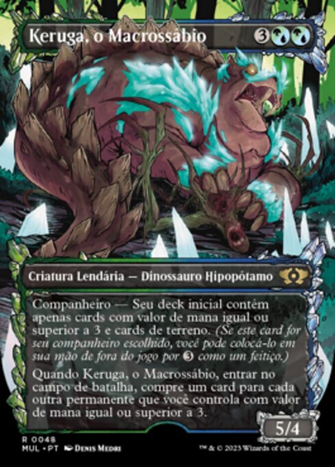 | Rules | Companion — Your starting deck contains only cards with mana value 3 or greater and land cards. (If this card is your chosen companion, you may put it into your hand from outside the game for any time you could cast a sorcery.) When Keruga, the Macrosage enters the battlefield, draw a card for each other permanent you control with mana value 3 or greater. |