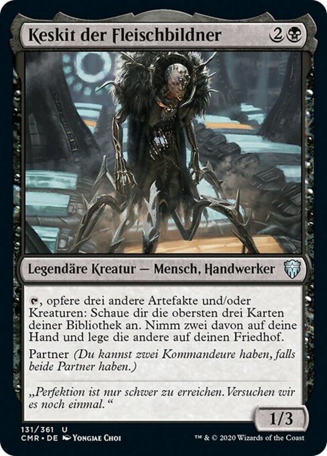 | Rules | , Sacrifice three other artifacts and/or creatures: Look at the top three cards of your library. Put two of them into your hand and the other into your graveyard. Partner (You can have two commanders if both have partner.) |