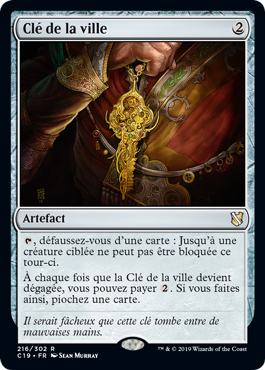 | Rules | , Discard a card: Up to one target creature can't be blocked this turn. Whenever Key to the City becomes untapped, you may pay . If you do, draw a card. |