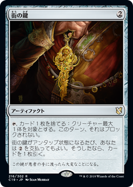| Rules | , Discard a card: Up to one target creature can't be blocked this turn. Whenever Key to the City becomes untapped, you may pay . If you do, draw a card. |