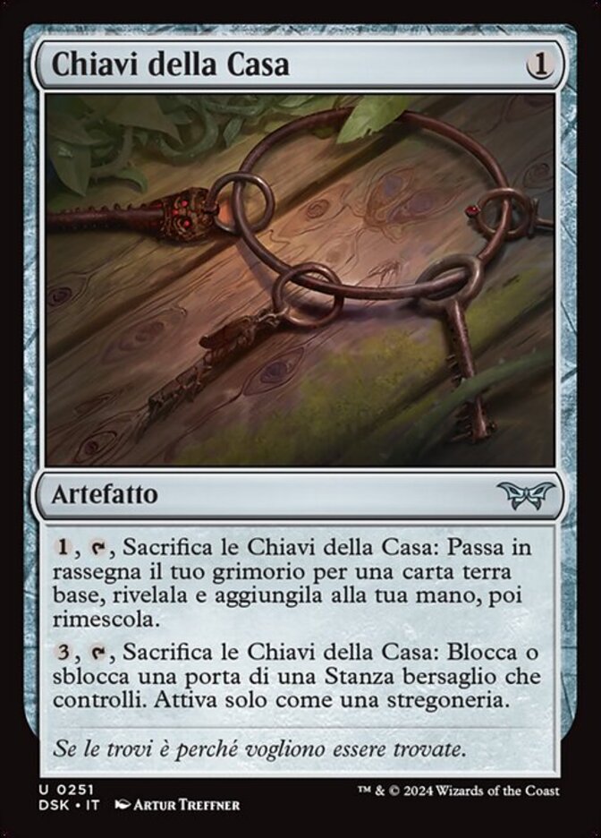 | Rules | , , Sacrifice Keys to the House: Search your library for a basic land card, reveal it, put it into your hand, then shuffle. , , Sacrifice Keys to the House: Lock or unlock a door of target Room you control. Activate only as a sorcery. |