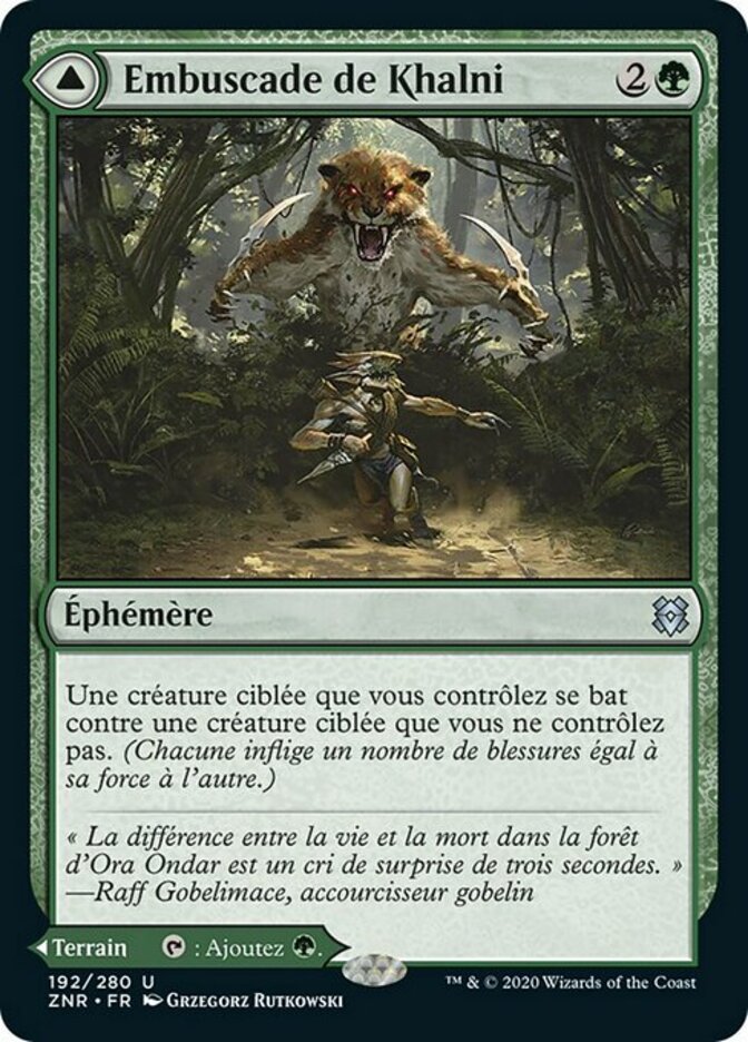 | Rules | Target creature you control fights target creature you don't control. (Each deals damage equal to its power to the other.) // Khalni Territory enters the battlefield tapped. : Add . |