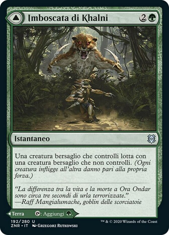 | Rules | Target creature you control fights target creature you don't control. (Each deals damage equal to its power to the other.) // Khalni Territory enters the battlefield tapped. : Add . |