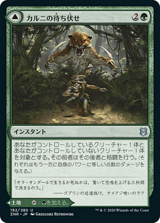 | Rules | Target creature you control fights target creature you don't control. (Each deals damage equal to its power to the other.) // Khalni Territory enters the battlefield tapped. : Add . |