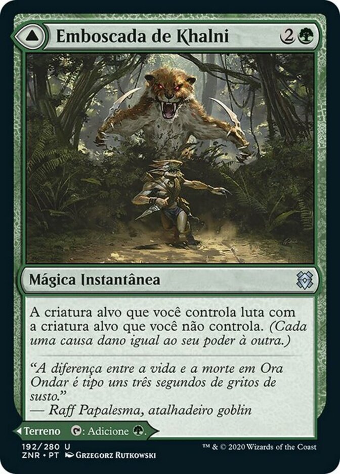 | Rules | Target creature you control fights target creature you don't control. (Each deals damage equal to its power to the other.) // Khalni Territory enters the battlefield tapped. : Add . |