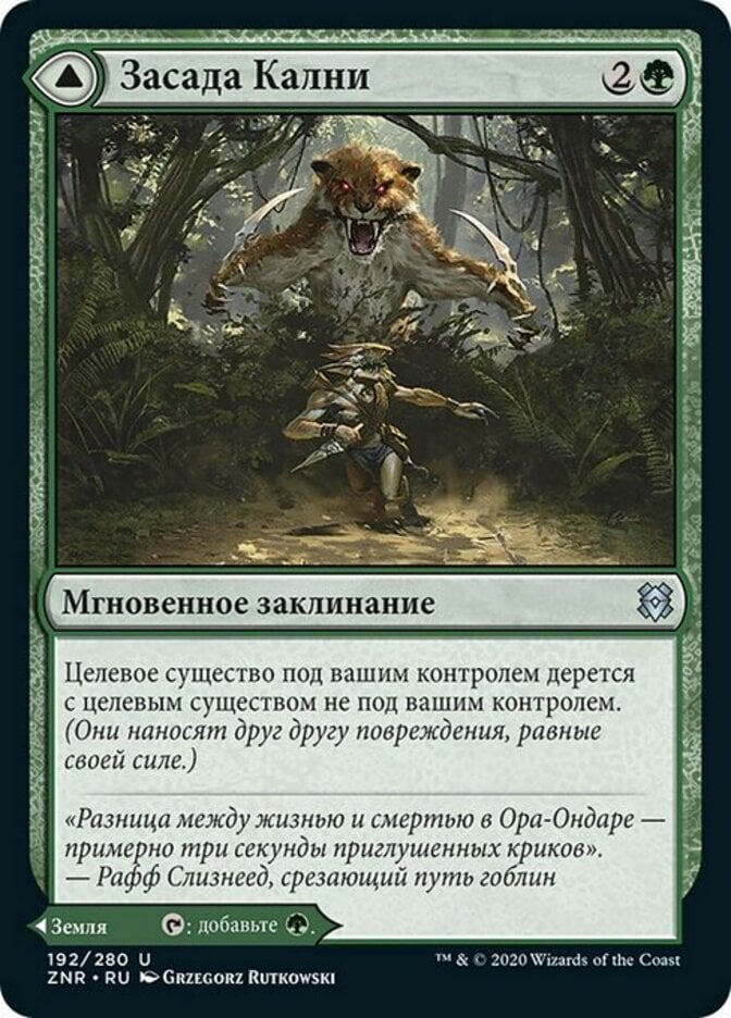 | Rules | Target creature you control fights target creature you don't control. (Each deals damage equal to its power to the other.) // Khalni Territory enters the battlefield tapped. : Add . |