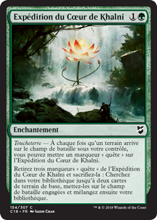 | Rules | Landfall — Whenever a land enters the battlefield under your control, you may put a quest counter on Khalni Heart Expedition. Remove three quest counters from Khalni Heart Expedition and sacrifice it: Search your library for up to two basic land cards, put them onto the battlefield tapped, then shuffle. |