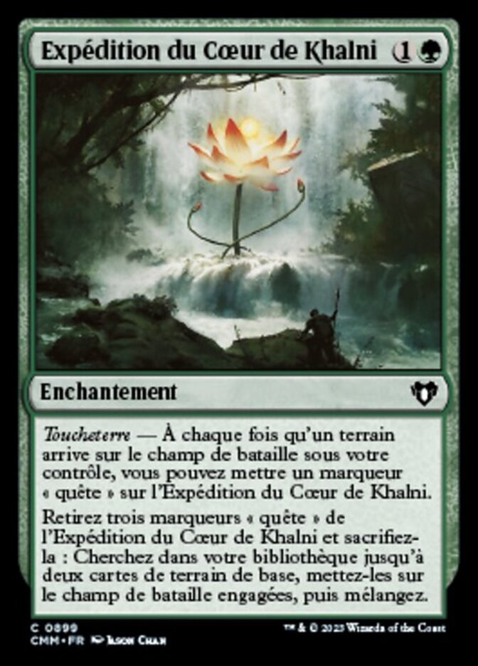| Rules | Landfall — Whenever a land enters the battlefield under your control, you may put a quest counter on Khalni Heart Expedition. Remove three quest counters from Khalni Heart Expedition and sacrifice it: Search your library for up to two basic land cards, put them onto the battlefield tapped, then shuffle. |