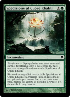 | Rules | Landfall — Whenever a land enters the battlefield under your control, you may put a quest counter on Khalni Heart Expedition. Remove three quest counters from Khalni Heart Expedition and sacrifice it: Search your library for up to two basic land cards, put them onto the battlefield tapped, then shuffle. |