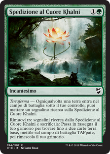 | Rules | Landfall — Whenever a land enters the battlefield under your control, you may put a quest counter on Khalni Heart Expedition. Remove three quest counters from Khalni Heart Expedition and sacrifice it: Search your library for up to two basic land cards, put them onto the battlefield tapped, then shuffle. |