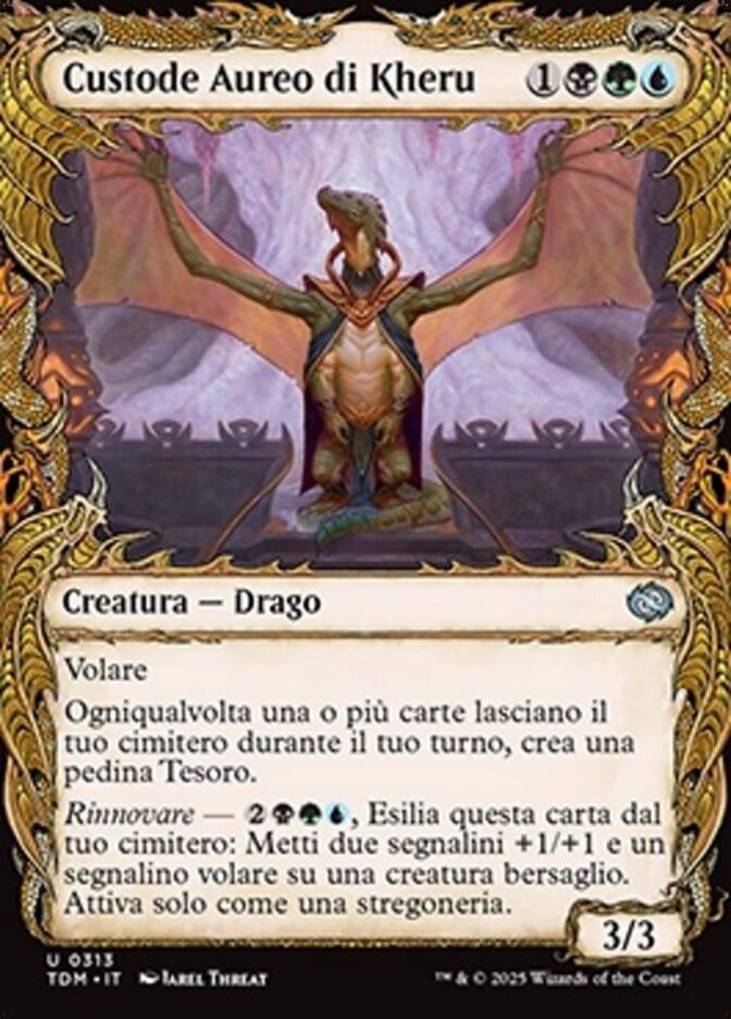| Rules | Flying Whenever one or more cards leave your graveyard during your turn, create a Treasure token. (It's an artifact with ", Sacrifice this token: Add one mana of any color.") Renew — , Exile this card from your graveyard: Put two +1/+1 counters and a flying counter on target creature. Activate only as a sorcery. |