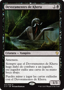 | Rules | Menace Whenever Kheru Mind-Eater deals combat damage to a player, that player exiles a card from their hand face down. You may look at cards exiled with Kheru Mind-Eater, and you may play lands and cast spells from among those cards. |