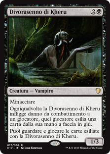 | Rules | Menace Whenever Kheru Mind-Eater deals combat damage to a player, that player exiles a card from their hand face down. You may look at cards exiled with Kheru Mind-Eater, and you may play lands and cast spells from among those cards. |