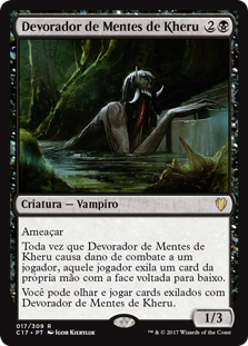 | Rules | Menace Whenever Kheru Mind-Eater deals combat damage to a player, that player exiles a card from their hand face down. You may look at cards exiled with Kheru Mind-Eater, and you may play lands and cast spells from among those cards. |