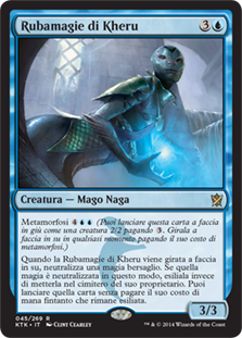 | Rules | Morph (You may cast this card face down as a 2/2 creature for . Turn it face up any time for its morph cost.) When Kheru Spellsnatcher is turned face up, counter target spell. If that spell is countered this way, exile it instead of putting it into its owner's graveyard. You may cast that card without paying its mana cost for as long as it remains exiled. |