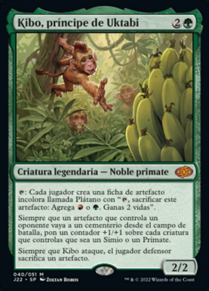 | Rules | : Each player creates a colorless artifact token named Banana with ", Sacrifice this artifact: Add or . You gain 2 life." Whenever an artifact an opponent controls is put into a graveyard from the battlefield, put a +1/+1 counter on each creature you control that's an Ape or Monkey. Whenever Kibo attacks, defending player sacrifices an artifact. |