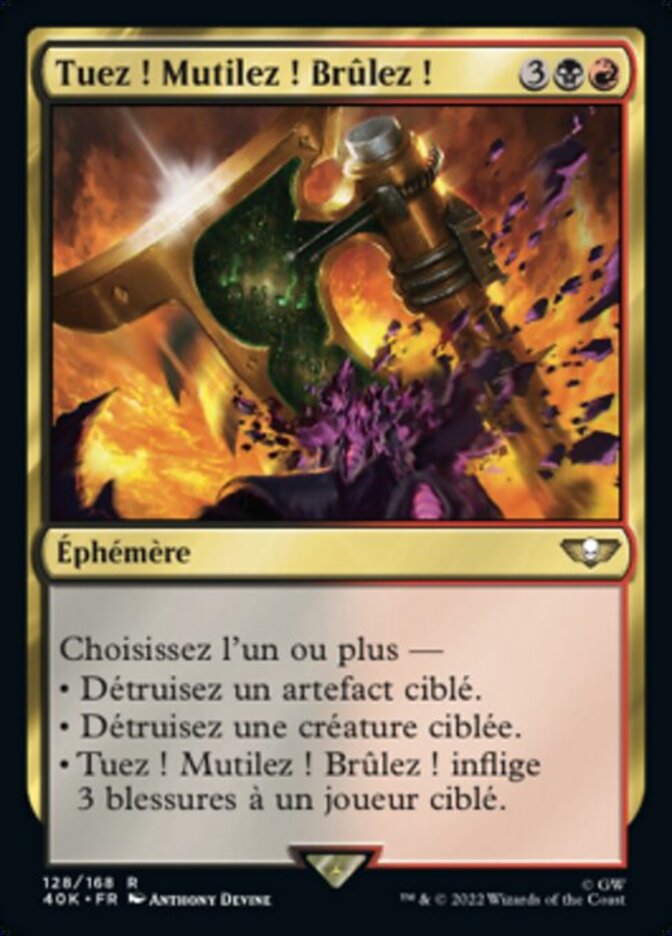 | Rules | Choose one or more — • Destroy target artifact. • Destroy target creature. • Kill! Maim! Burn! deals 3 damage to target player. |