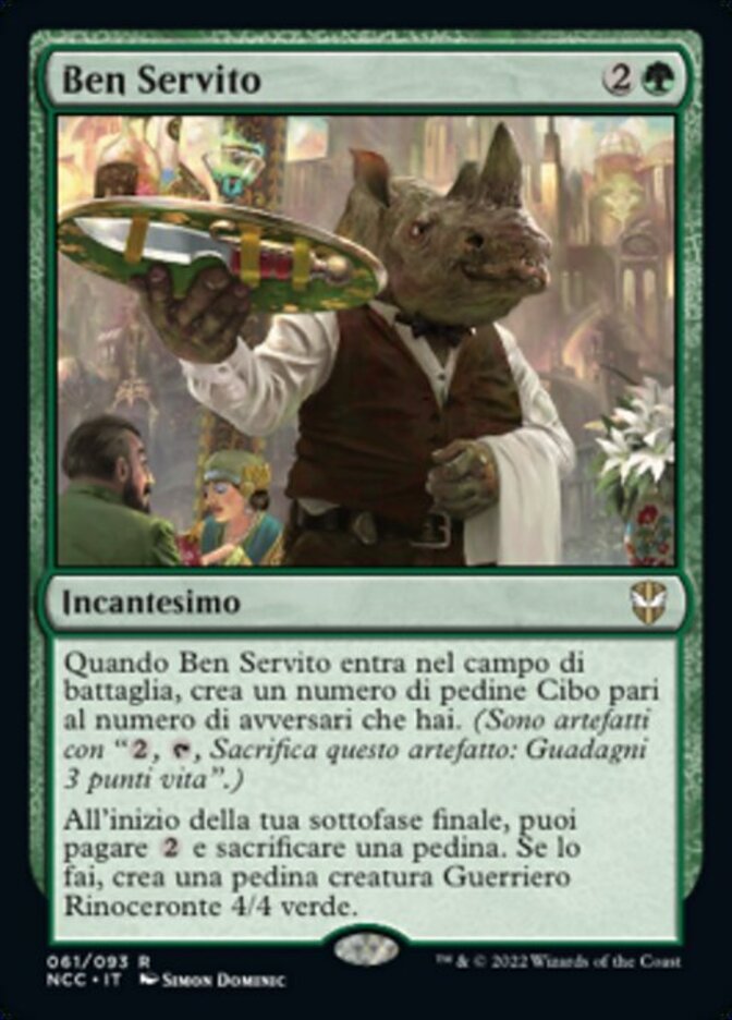 | Rules | When Killer Service enters the battlefield, create a number of Food tokens equal to the number of opponents you have. (They're artifacts with ", , Sacrifice this artifact: You gain 3 life.") At the beginning of your end step, you may pay and sacrifice a token. If you do, create a 4/4 green Rhino Warrior creature token. |