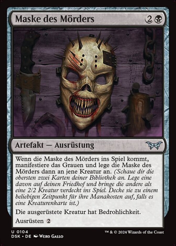 | Rules | When Killer's Mask enters, manifest dread, then attach Killer's Mask to that creature. (Look at the top two cards of your library. Put one onto the battlefield face down as a 2/2 creature and the other into your graveyard. Turn it face up any time for its mana cost if it's a creature card.) Equipped creature has menace. Equip |