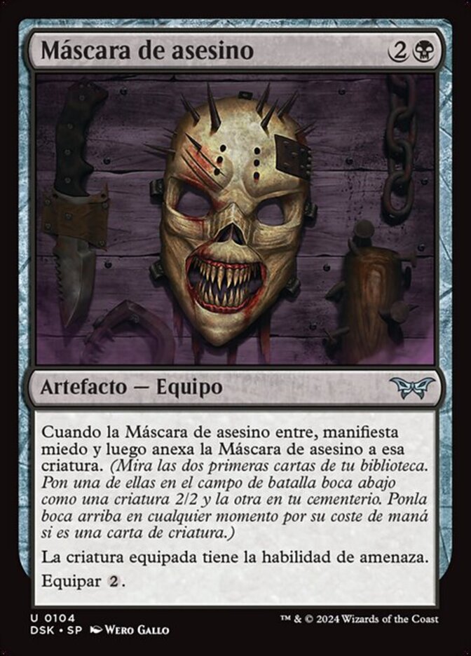 | Rules | When Killer's Mask enters, manifest dread, then attach Killer's Mask to that creature. (Look at the top two cards of your library. Put one onto the battlefield face down as a 2/2 creature and the other into your graveyard. Turn it face up any time for its mana cost if it's a creature card.) Equipped creature has menace. Equip |