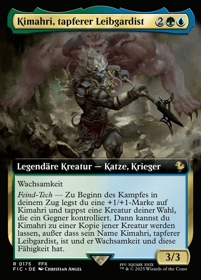 | Rules | Vigilance Ronso Rage — At the beginning of combat on your turn, put a +1/+1 counter on Kimahri and tap target creature an opponent controls. Then you may have Kimahri become a copy of that creature, except its name is Kimahri, Valiant Guardian and it has vigilance and this ability. |