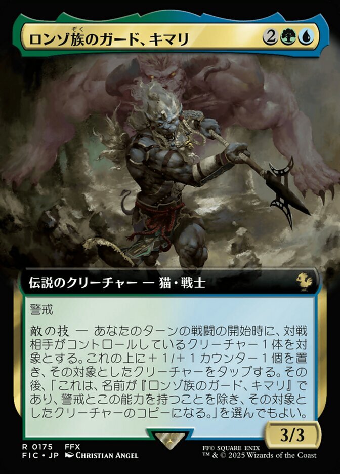 | Rules | Vigilance Ronso Rage — At the beginning of combat on your turn, put a +1/+1 counter on Kimahri and tap target creature an opponent controls. Then you may have Kimahri become a copy of that creature, except its name is Kimahri, Valiant Guardian and it has vigilance and this ability. |