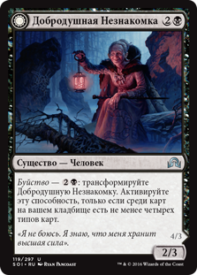 | Rules | Delirium — : Transform Kindly Stranger. Activate only if there are four or more card types among cards in your graveyard. // When this creature transforms into Demon-Possessed Witch, you may destroy target creature. |