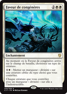 | Rules | As Kindred Boon enters the battlefield, choose a creature type. : Put a divinity counter on target creature you control of the chosen type. Each creature you control with a divinity counter on it has indestructible. |