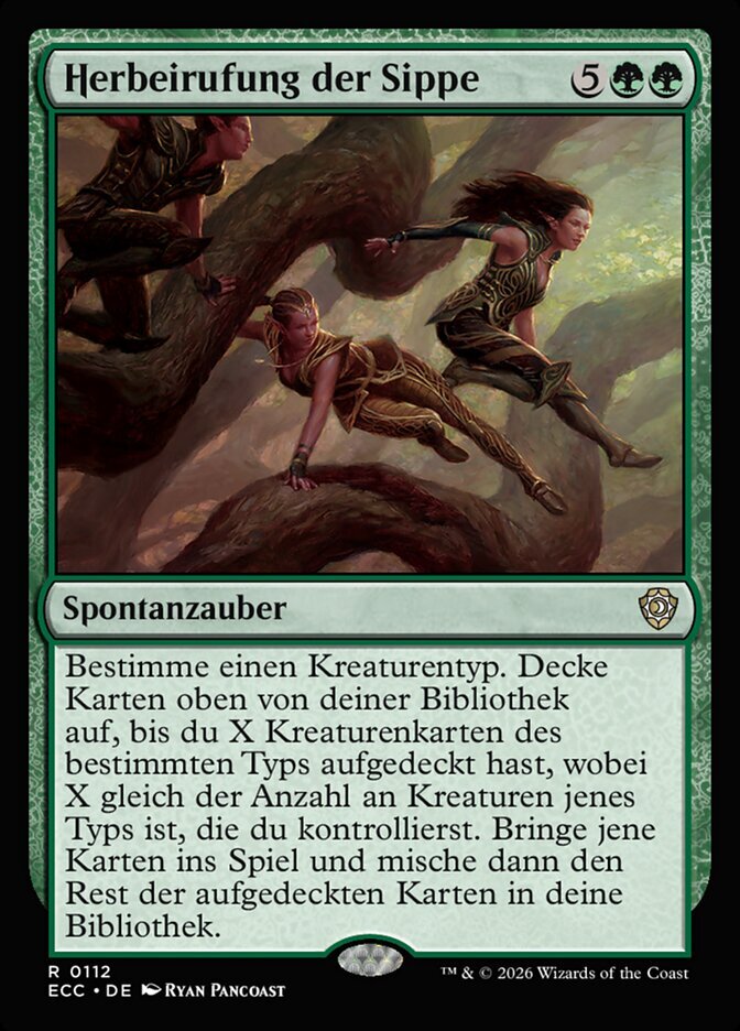Rules Choose a creature type. Reveal cards from the top of your library until you reveal X creature cards of the chosen type, where X is the number of creatures you control of that type. Put those cards onto the battlefield, then shuffle the rest of the revealed cards into your library.