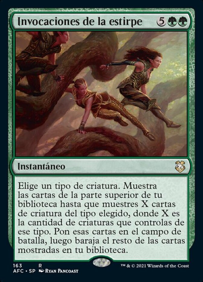| Rules | Choose a creature type. Reveal cards from the top of your library until you reveal X creature cards of the chosen type, where X is the number of creatures you control of that type. Put those cards onto the battlefield, then shuffle the rest of the revealed cards into your library. |