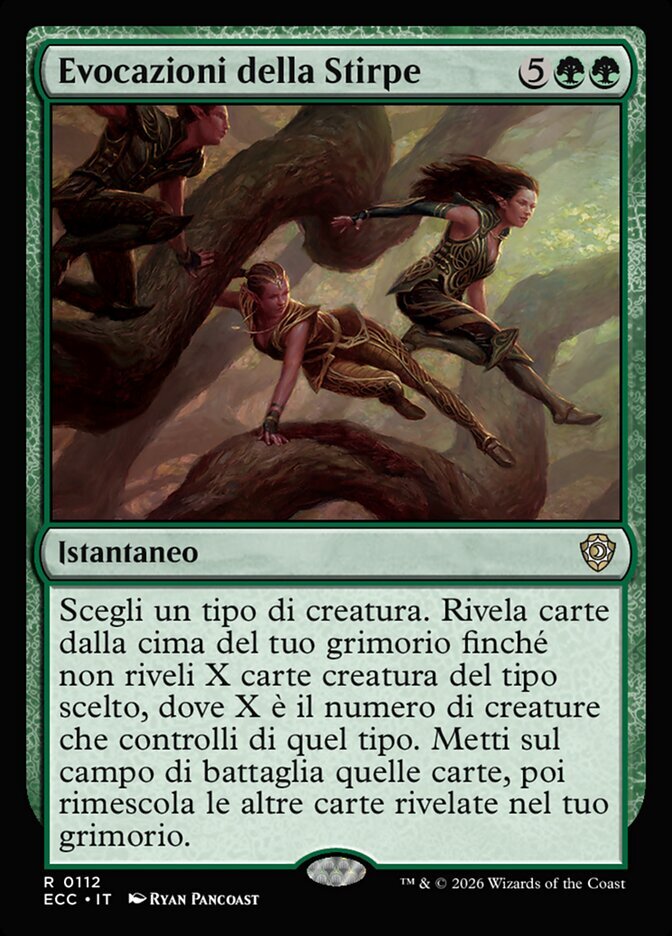 | Rules | Choose a creature type. Reveal cards from the top of your library until you reveal X creature cards of the chosen type, where X is the number of creatures you control of that type. Put those cards onto the battlefield, then shuffle the rest of the revealed cards into your library. |