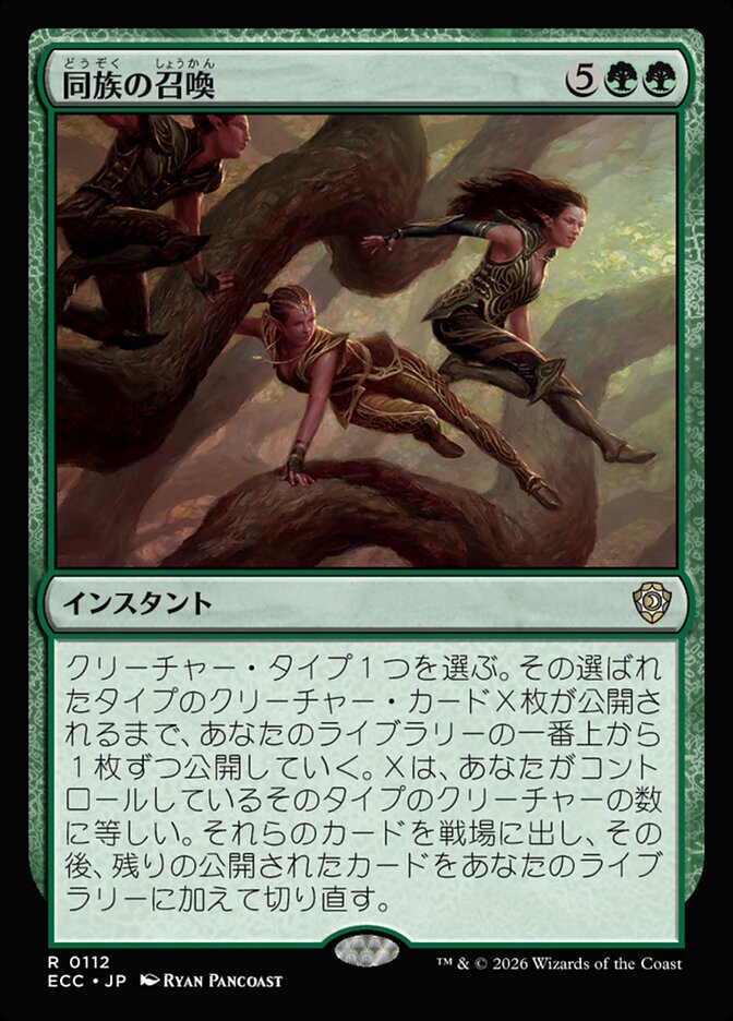 | Rules | Choose a creature type. Reveal cards from the top of your library until you reveal X creature cards of the chosen type, where X is the number of creatures you control of that type. Put those cards onto the battlefield, then shuffle the rest of the revealed cards into your library. |