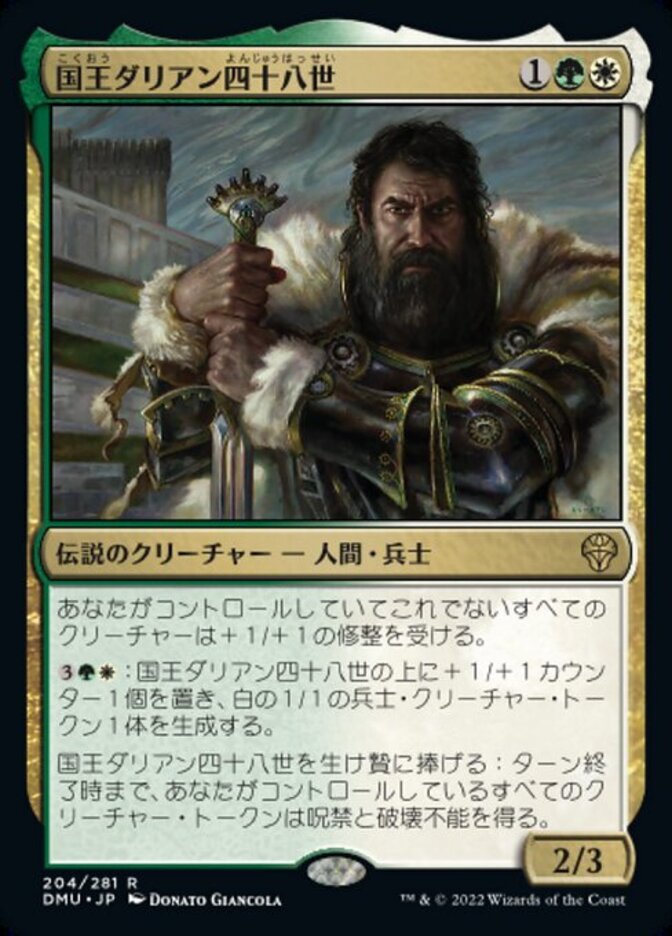 | Rules | Other creatures you control get +1/+1. : Put a +1/+1 counter on King Darien and create a 1/1 white Soldier creature token. Sacrifice King Darien: Creature tokens you control gain hexproof and indestructible until end of turn. |
