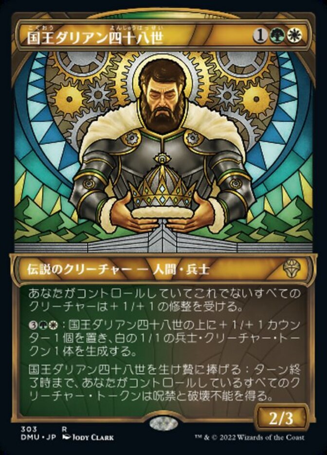 | Rules | Other creatures you control get +1/+1. : Put a +1/+1 counter on King Darien and create a 1/1 white Soldier creature token. Sacrifice King Darien: Creature tokens you control gain hexproof and indestructible until end of turn. |