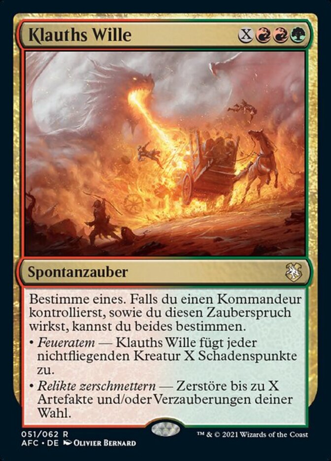 | Rules | Choose one. If you control a commander as you cast this spell, you may choose both. • Breathe Flame — Klauth's Will deals X damage to each creature without flying. • Smash Relics — Destroy up to X target artifacts and/or enchantments. |
