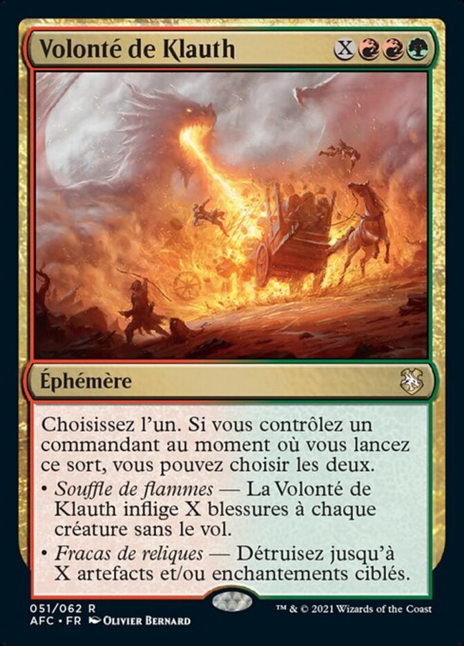 | Rules | Choose one. If you control a commander as you cast this spell, you may choose both. • Breathe Flame — Klauth's Will deals X damage to each creature without flying. • Smash Relics — Destroy up to X target artifacts and/or enchantments. |