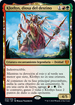 | Rules | Indestructible As long as your devotion to red and green is less than seven, Klothys isn't a creature. At the beginning of your precombat main phase, exile target card from a graveyard. If it was a land card, add or . Otherwise, you gain 2 life and Klothys deals 2 damage to each opponent. |