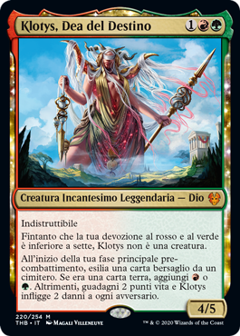 | Rules | Indestructible As long as your devotion to red and green is less than seven, Klothys isn't a creature. At the beginning of your precombat main phase, exile target card from a graveyard. If it was a land card, add or . Otherwise, you gain 2 life and Klothys deals 2 damage to each opponent. |