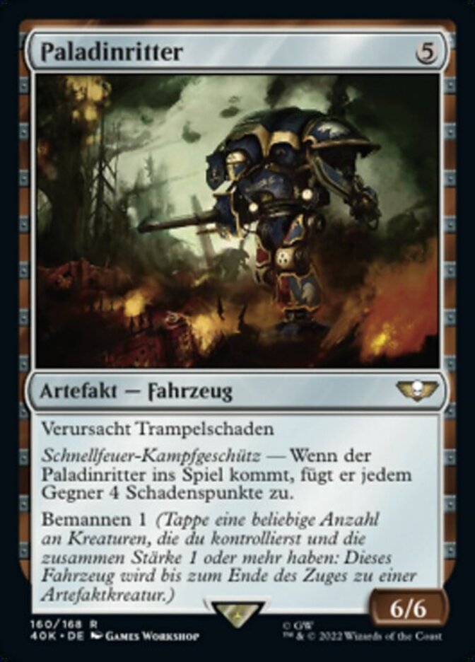 | Rules | Trample Rapid-fire Battle Cannon — When Knight Paladin enters the battlefield, it deals 4 damage to each opponent. Crew 1 (Tap any number of creatures you control with total power 1 or more: This Vehicle becomes an artifact creature until end of turn.) |