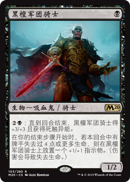 | Rules | : Knight of the Ebon Legion gets +3/+3 and gains deathtouch until end of turn. At the beginning of your end step, if a player lost 4 or more life this turn, put a +1/+1 counter on Knight of the Ebon Legion. (Damage causes loss of life.) |