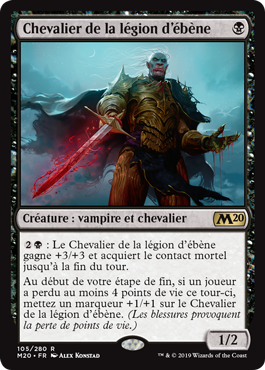 | Rules | : Knight of the Ebon Legion gets +3/+3 and gains deathtouch until end of turn. At the beginning of your end step, if a player lost 4 or more life this turn, put a +1/+1 counter on Knight of the Ebon Legion. (Damage causes loss of life.) |