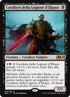 | Rules | : Knight of the Ebon Legion gets +3/+3 and gains deathtouch until end of turn. At the beginning of your end step, if a player lost 4 or more life this turn, put a +1/+1 counter on Knight of the Ebon Legion. (Damage causes loss of life.) |