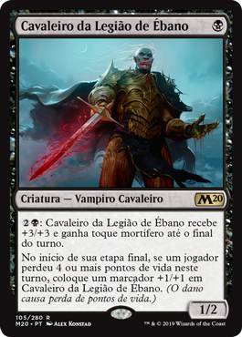 | Rules | : Knight of the Ebon Legion gets +3/+3 and gains deathtouch until end of turn. At the beginning of your end step, if a player lost 4 or more life this turn, put a +1/+1 counter on Knight of the Ebon Legion. (Damage causes loss of life.) |