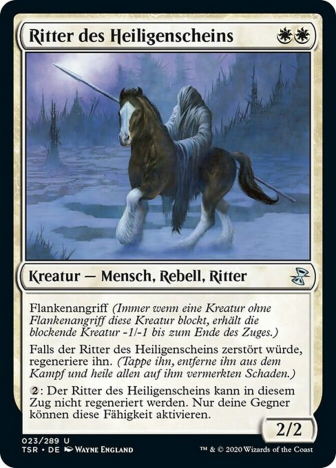 | Rules | Flanking (Whenever a creature without flanking blocks this creature, the blocking creature gets -1/-1 until end of turn.) If Knight of the Holy Nimbus would be destroyed, regenerate it. (Tap it, remove it from combat, and heal all damage on it.) : Knight of the Holy Nimbus can't be regenerated this turn. Only your opponents may activate this ability. |
